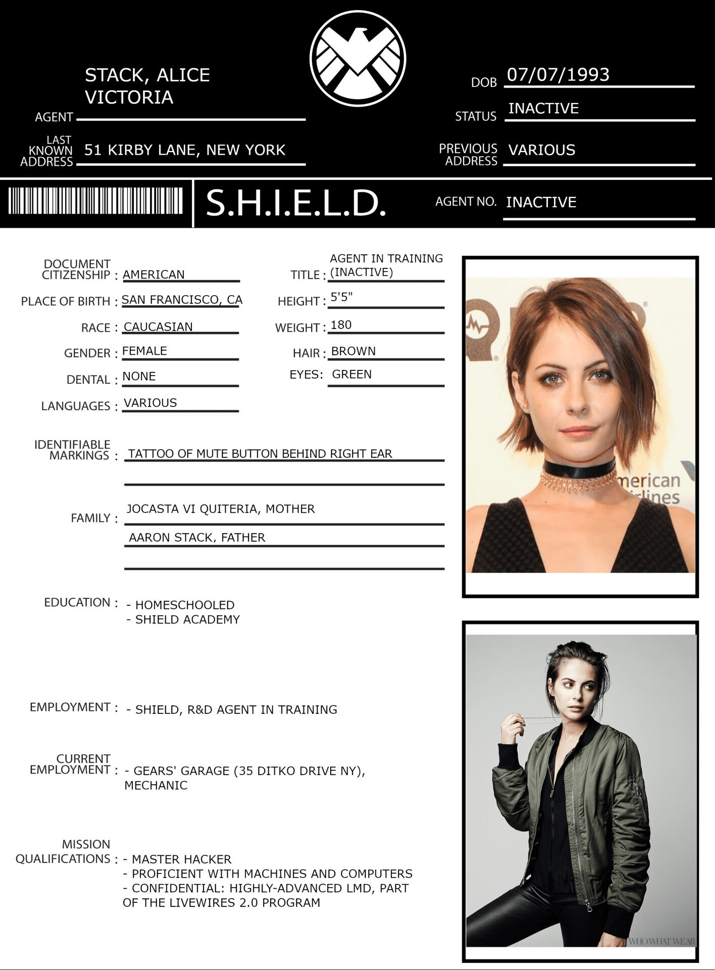 The daughter of Aaron Stack & Jocasta, Alice was first created in honor of a fallen shield agent partner of Aaron's. As time went on, Alice too went to SHIELD Academy although she ended up leaving to do her own vigilante work. Now, she operates as the superhero Armory while still freelancing for SHIELD and other private security operations.Headstrong and brave, Alice is always the first to jump into a fight if it means saving the people she cares about. Her past experiences have disillusioned her about the 'good way' to do things, but she still has a strong moral compass and the utmost loyalty for her people.